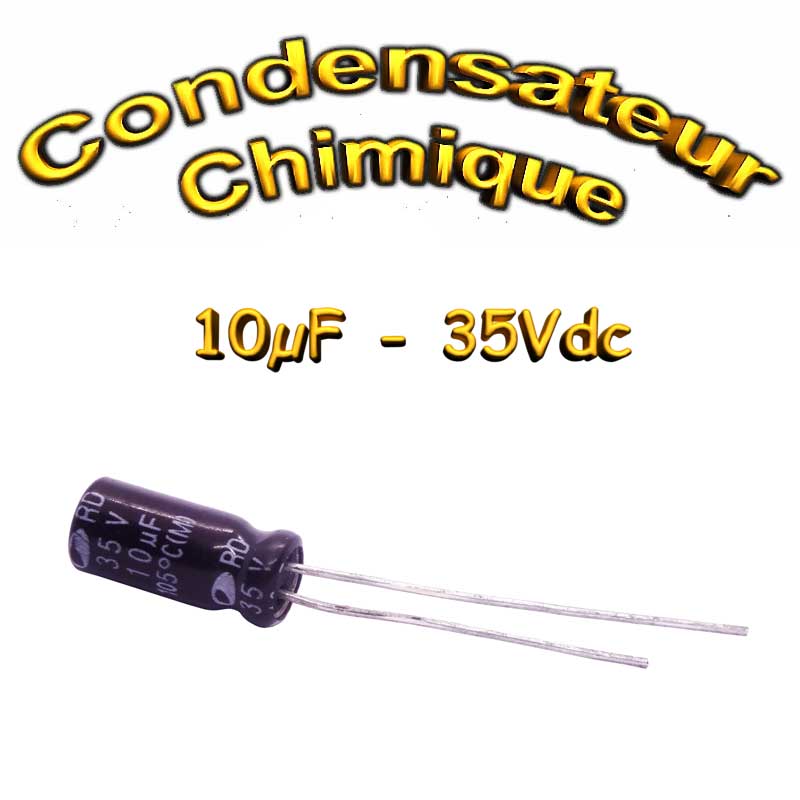 Très présent en électronique le Condensateur chimique 10uF 35V peut être polarisé ou non et sert généralement dans les applications suivantes: son utilisation première est d’emmagasiner temporairement des charges électriques, il sert aussi dans les circuit de synchronisation électronique (TV, hifi), dans les filtres électroniques ainsi que pour la transmission de signaux et dans bien d’autre application