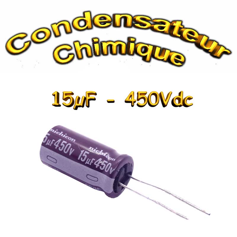 Très présent en électronique le Condensateur chimique 15uF 450V peut être polarisé ou non et sert généralement dans les applications suivantes: son utilisation première est d’emmagasiner temporairement des charges électriques, il sert aussi dans les circuit de synchronisation électronique (TV, hifi), dans les filtres électroniques ainsi que pour la transmission de signaux et dans bien d’autre application