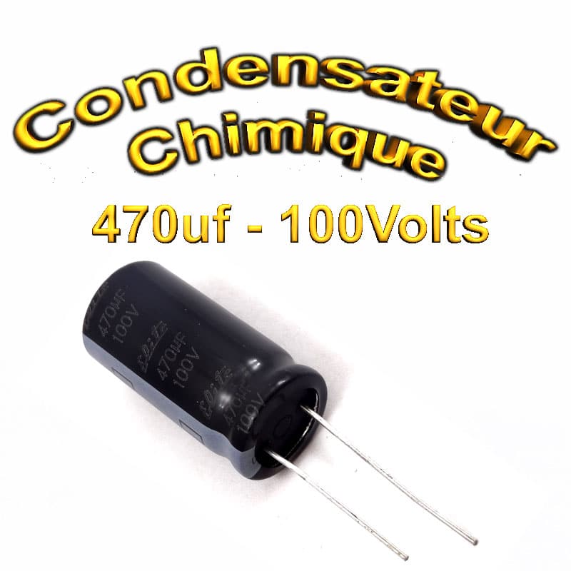 Très présent en électronique le Condensateur chimique 470uF 100V peut être polarisé ou non et sert généralement dans les applications suivantes: son utilisation première est d’emmagasiner temporairement des charges électriques, il sert aussi dans les circuit de synchronisation électronique (TV, hifi), dans les filtres électroniques ainsi que pour la transmission de signaux et dans bien d’autre application
