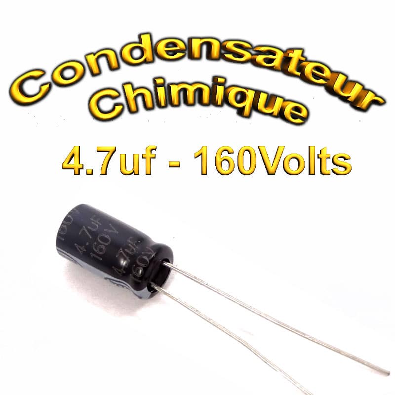 Très présent en électronique le Condensateur chimique 4,7uF 160V peut être polarisé ou non et sert généralement dans les applications suivantes: son utilisation première est d’emmagasiner temporairement des charges électriques, il sert aussi dans les circuit de synchronisation électronique (TV, hifi), dans les filtres électroniques ainsi que pour la transmission de signaux et dans bien d’autre application