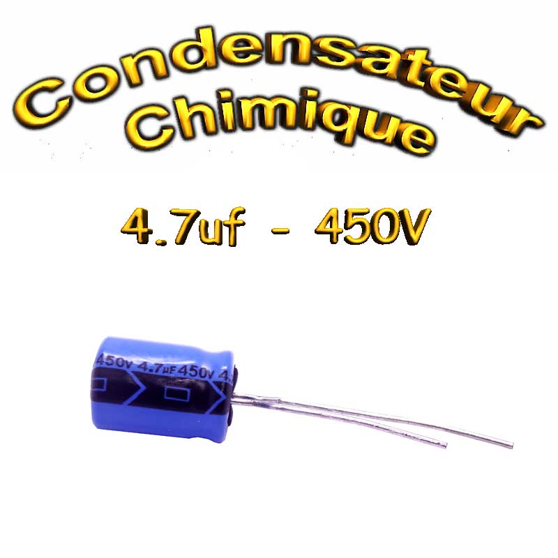 Très présent en électronique le Condensateur chimique 4,7uF 450V peut être polarisé ou non et sert généralement dans les applications suivantes: son utilisation première est d’emmagasiner temporairement des charges électriques, il sert aussi dans les circuit de synchronisation électronique (TV, hifi), dans les filtres électroniques ainsi que pour la transmission de signaux et dans bien d’autre application