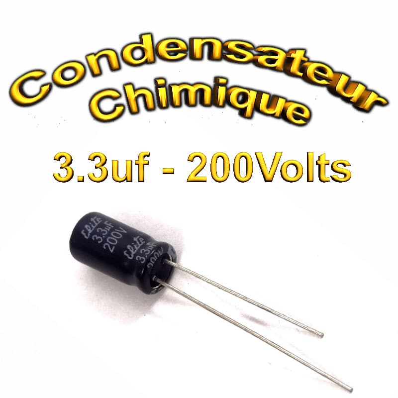 Très présent en électronique le Condensateur chimique 3,3uF 200V peut être polarisé ou non et sert généralement dans les applications suivantes: son utilisation première est d’emmagasiner temporairement des charges électriques, il sert aussi dans les circuit de synchronisation électronique (TV, hifi), dans les filtres électroniques ainsi que pour la transmission de signaux et dans bien d’autre application